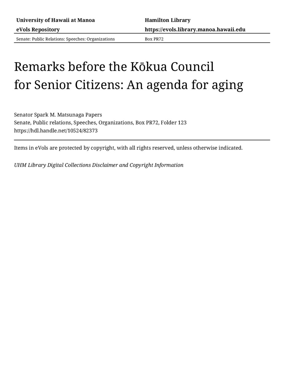 - Remarks before the Kōkua Council for Senior Citizens: An agenda for aging