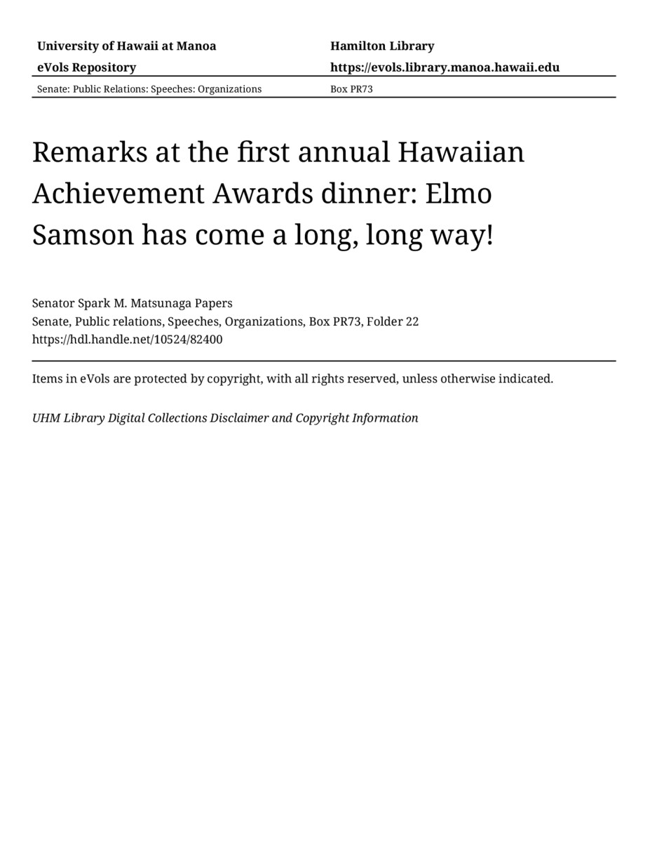 - Remarks at the first annual Hawaiian Achievement Awards dinner: Elmo Samson has come a long, long way!