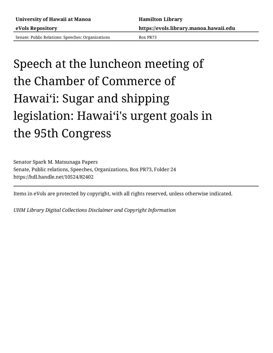 Speech at the luncheon meeting of the Chamber of Commerce of Hawaiʻi: Sugar and shipping legislation: Hawaiʻi's urgent goals in the 95th Congress, 12/02/76, Senate, Public relations, Speeches, Organizations, Box PR73, Folder 24, Senator Spark M. Matsunaga Papers, Hawaiʻi Congressional Papers Collection, University of Hawaiʻi at Mānoa Library, Honolulu, HI. https://omekas-congress.lib.wvu.edu/catalog/10524_82402 (accessed April 12, 2026).