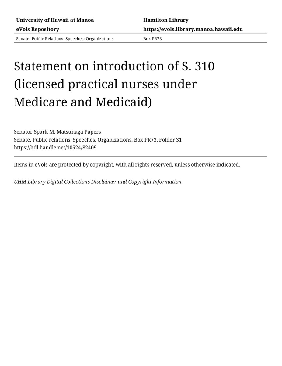 - Statement on introduction of S. 310 (licensed practical nurses under Medicare and Medicaid)