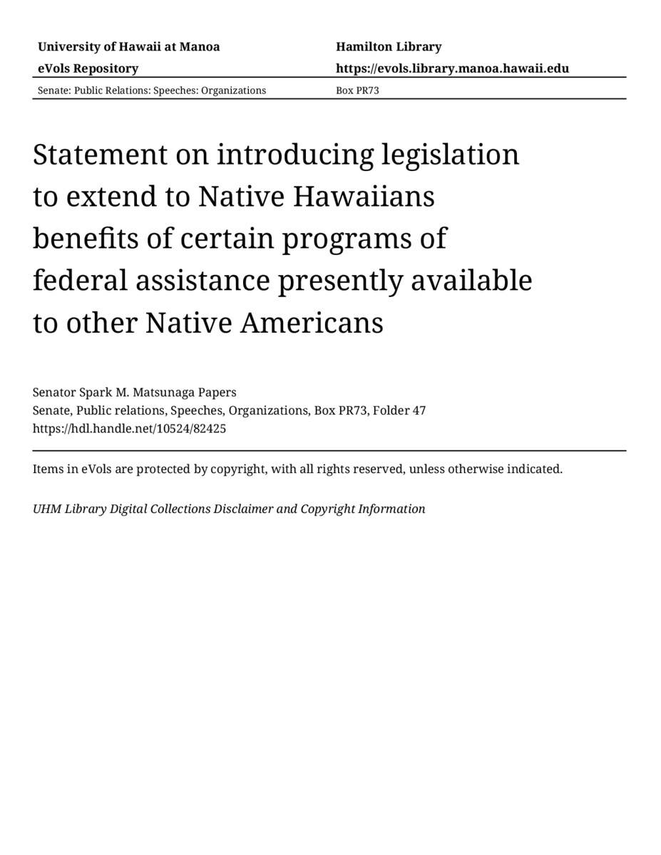 Statement on introducing legislation to extend to Native Hawaiians benefits of certain programs of federal assistance presently available to other Native Americans, 03/08/77, Senate, Public relations, Speeches, Organizations, Box PR73, Folder 47, Senator Spark M. Matsunaga Papers, Hawaiʻi Congressional Papers Collection, University of Hawaiʻi at Mānoa Library, Honolulu, HI. https://omekas-congress.lib.wvu.edu/catalog/10524_82425 (accessed April 13, 2026).