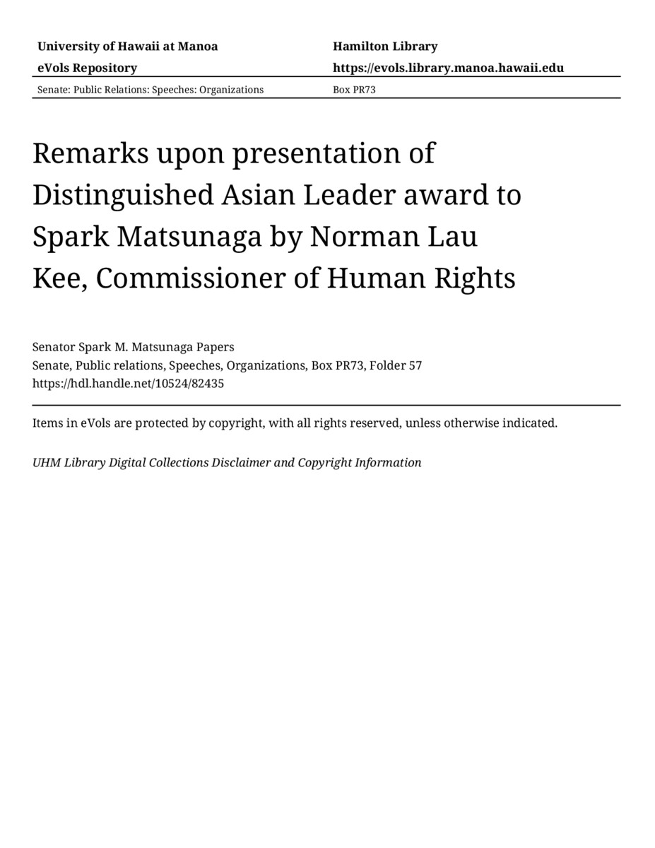 - Remarks upon presentation of Distinguished Asian Leader award to Spark Matsunaga by Norman Lau Kee, Commissioner of Human Rights