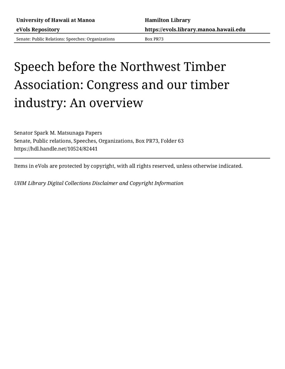 - Speech before the Northwest Timber Association: Congress and our timber industry: An overview