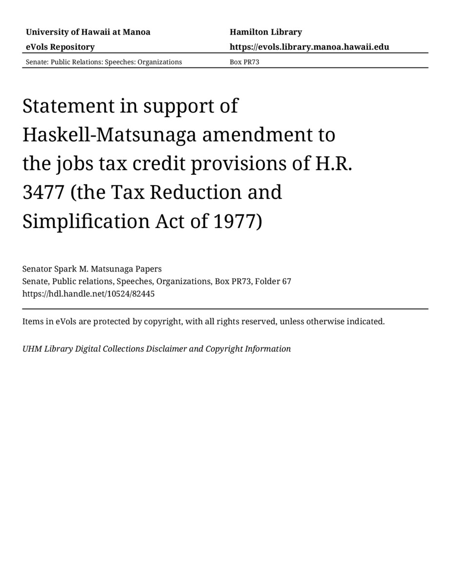 Statement in support of Haskell-Matsunaga amendment to the jobs tax credit provisions of H.R. 3477 (the Tax Reduction and Simplification Act of 1977), 04/20/77, Senate, Public relations, Speeches, Organizations, Box PR73, Folder 67, Senator Spark M. Matsunaga Papers, Hawaiʻi Congressional Papers Collection, University of Hawaiʻi at Mānoa Library, Honolulu, HI. https://omekas-congress.lib.wvu.edu/catalog/10524_82445 (accessed April 19, 2026).