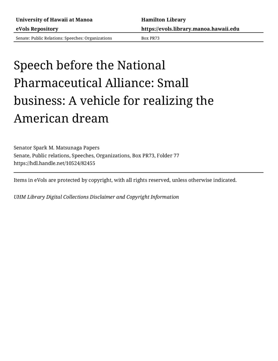 Speech before the National Pharmaceutical Alliance: Small business: A vehicle for realizing the American dream