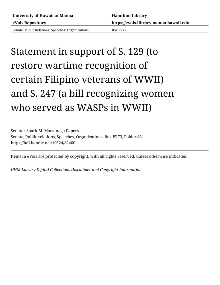 Statement in support of S. 129 (to restore wartime recognition of certain Filipino veterans of WWII) and S. 247 (a bill recognizing women who served as WASPs in WWII), 05/25/77, Senate, Public relations, Speeches, Organizations, Box PR73, Folder 82, Senator Spark M. Matsunaga Papers, Hawaiʻi Congressional Papers Collection, University of Hawaiʻi at Mānoa Library, Honolulu, HI. https://omekas-congress.lib.wvu.edu/catalog/10524_82460 (accessed April 17, 2026).