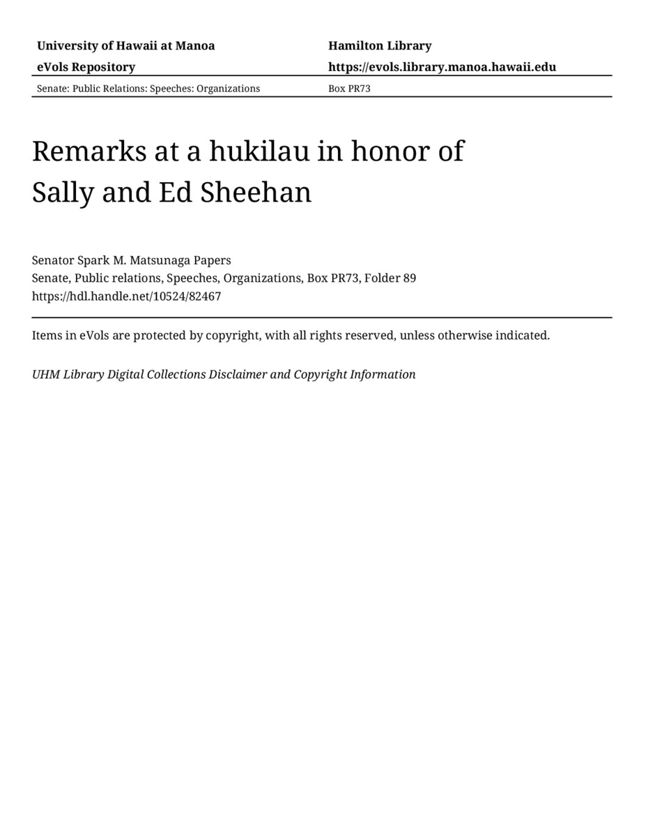 Remarks at a hukilau in honor of Sally and Ed Sheehan, 06/04/77, Senate, Public relations, Speeches, Organizations, Box PR73, Folder 89, Senator Spark M. Matsunaga Papers, Hawaiʻi Congressional Papers Collection, University of Hawaiʻi at Mānoa Library, Honolulu, HI. https://omekas-congress.lib.wvu.edu/catalog/10524_82467 (accessed April 17, 2026).