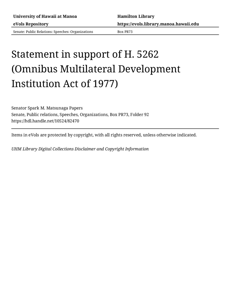 - Statement in support of H. 5262 (Omnibus Multilateral Development Institution Act of 1977)