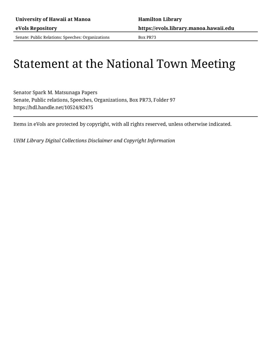 Statement at the National Town Meeting, 06/29/77, Senate, Public relations, Speeches, Organizations, Box PR73, Folder 97, Senator Spark M. Matsunaga Papers, Hawaiʻi Congressional Papers Collection, University of Hawaiʻi at Mānoa Library, Honolulu, HI. https://omekas-congress.lib.wvu.edu/catalog/10524_82475 (accessed April 18, 2026).