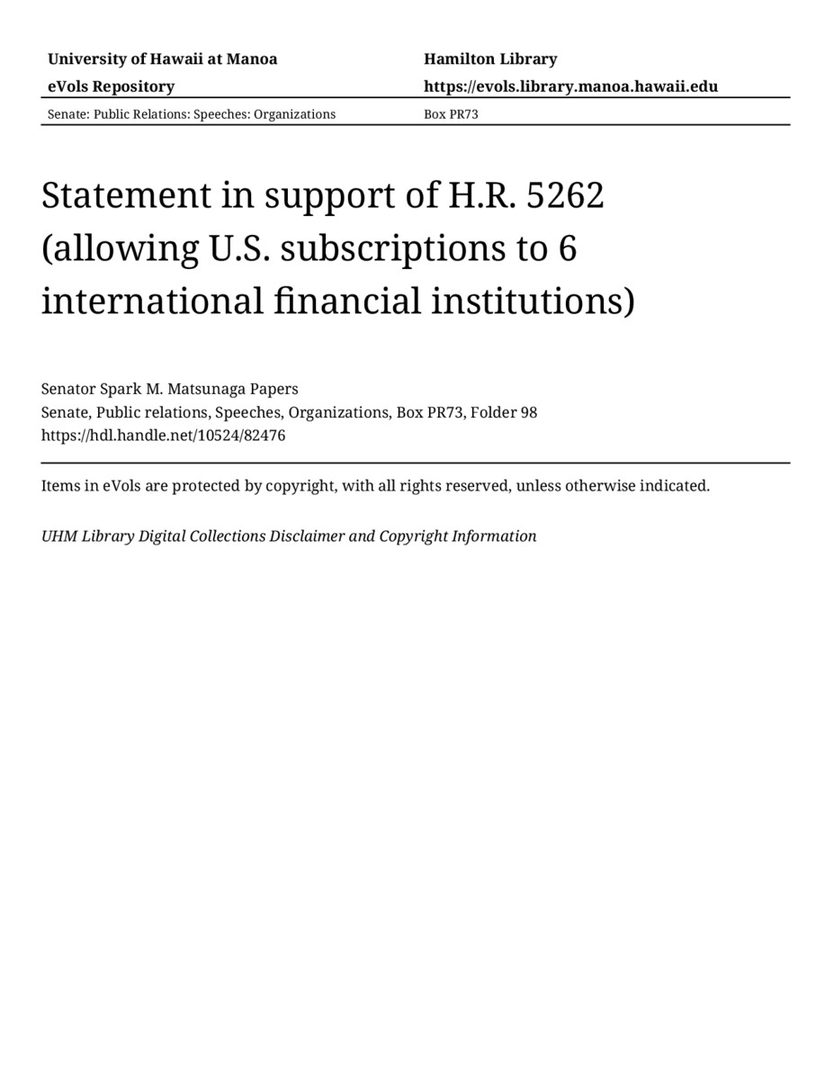 - Statement in support of H.R. 5262 (allowing U.S. subscriptions to 6 international financial institutions)