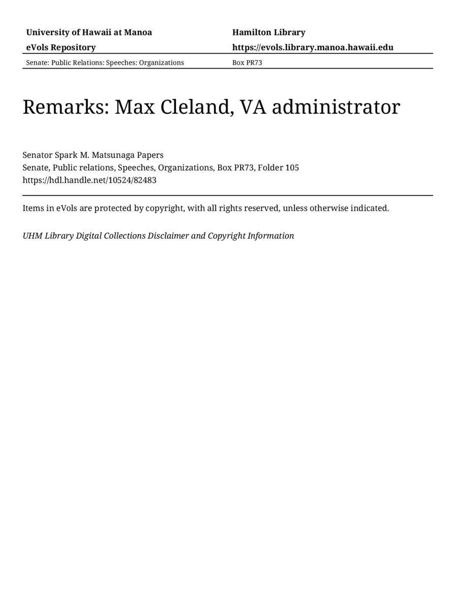 Remarks: Max Cleland, VA administrator, 07/19/77, Senate, Public relations, Speeches, Organizations, Box PR73, Folder 105, Senator Spark M. Matsunaga Papers, Hawaiʻi Congressional Papers Collection, University of Hawaiʻi at Mānoa Library, Honolulu, HI. https://omekas-congress.lib.wvu.edu/catalog/10524_82483 (accessed April 19, 2026).