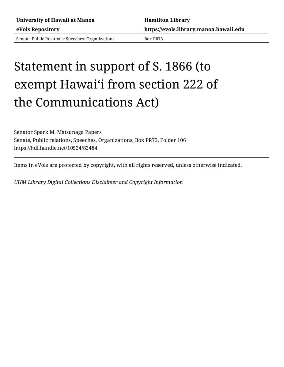 - Statement in support of S. 1866 (to exempt Hawaiʻi from section 222 of the Communications Act)