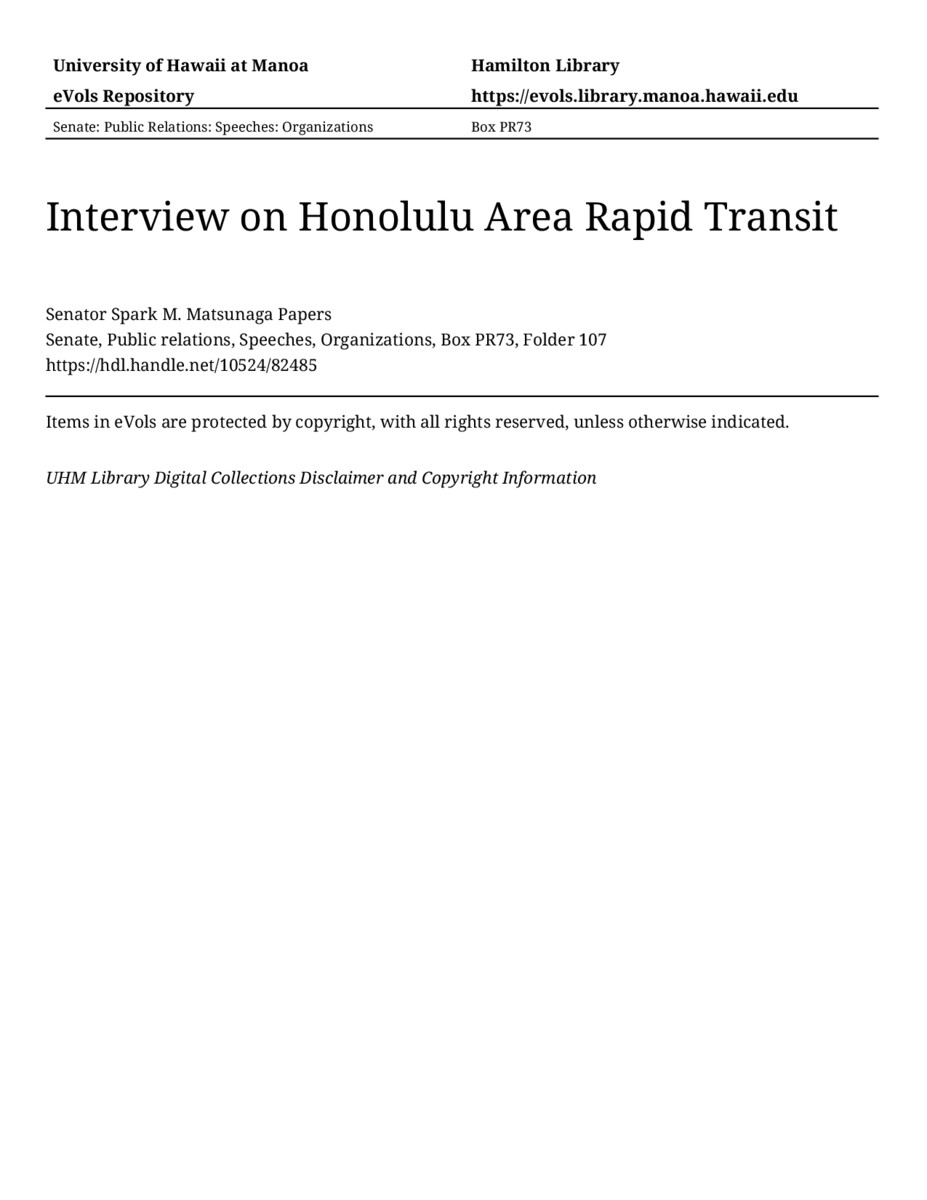 Interview on Honolulu Area Rapid Transit, 07/21/77, Senate, Public relations, Speeches, Organizations, Box PR73, Folder 107, Senator Spark M. Matsunaga Papers, Hawaiʻi Congressional Papers Collection, University of Hawaiʻi at Mānoa Library, Honolulu, HI. https://omekas-congress.lib.wvu.edu/catalog/10524_82485 (accessed April 20, 2026).
