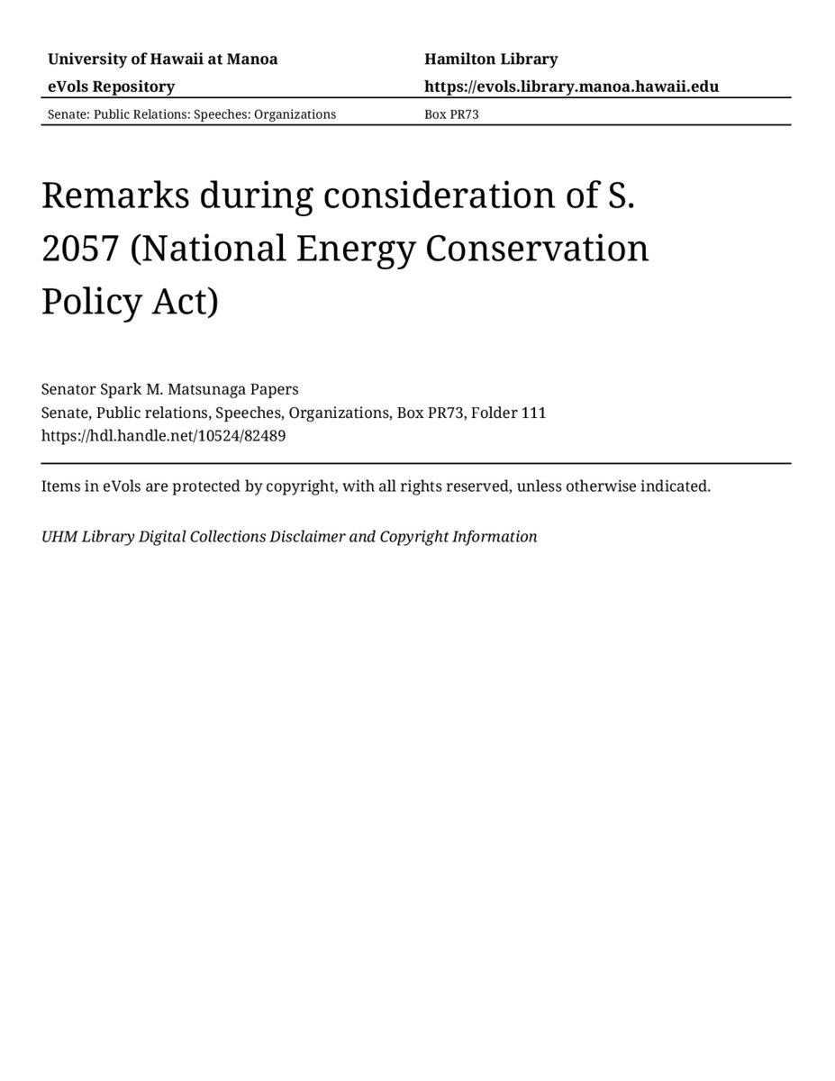 - Remarks during consideration of S. 2057 (National Energy Conservation Policy Act)