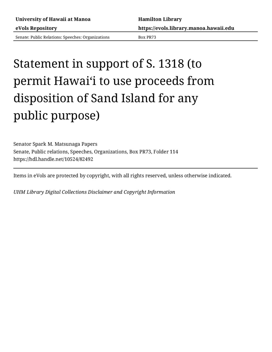- Statement in support of S. 1318 (to permit Hawaiʻi to use proceeds from disposition of Sand Island for any public purpose)