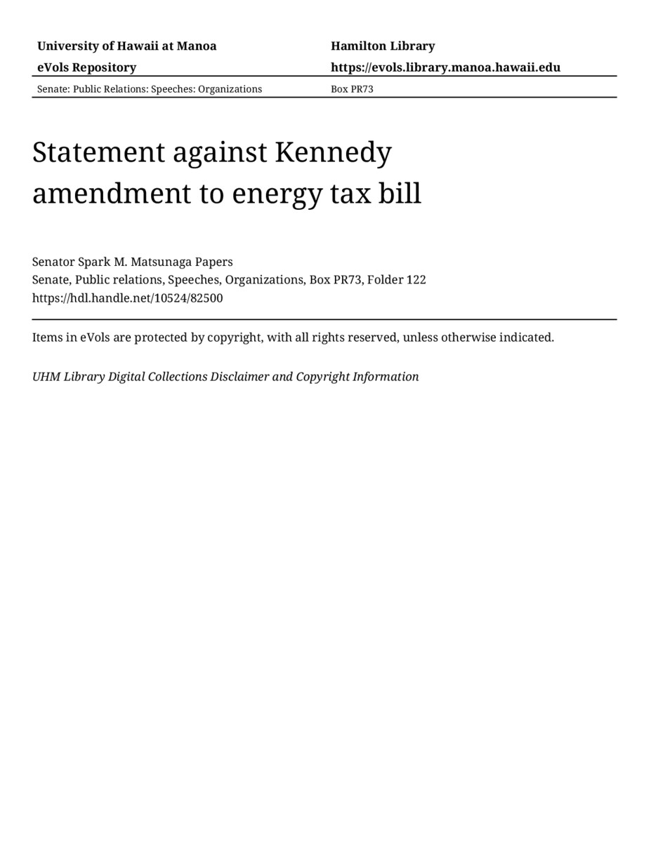 Statement against Kennedy amendment to energy tax bill, 10/31/77, Senate, Public relations, Speeches, Organizations, Box PR73, Folder 122, Senator Spark M. Matsunaga Papers, Hawaiʻi Congressional Papers Collection, University of Hawaiʻi at Mānoa Library, Honolulu, HI. https://omekas-congress.lib.wvu.edu/catalog/10524_82500 (accessed April 20, 2026).