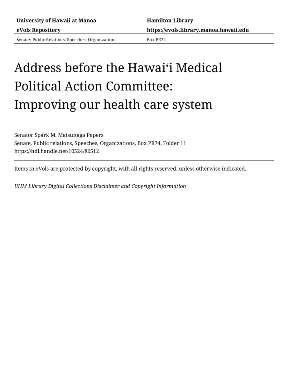 - Address before the Hawaiʻi Medical Political Action Committee: Improving our health care system