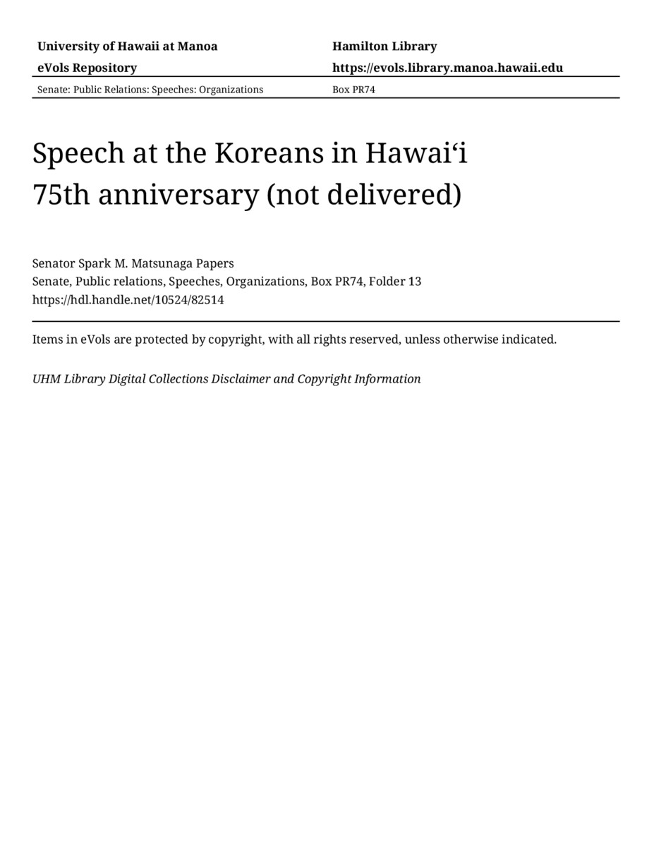 - Speech at the Koreans in Hawaiʻi 75th anniversary (not delivered)