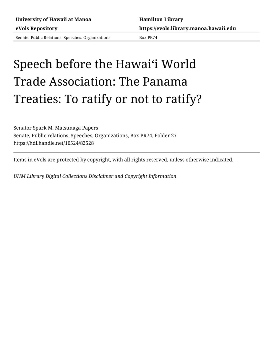 - Speech before the Hawaiʻi World Trade Association: The Panama Treaties: To ratify or not to ratify?