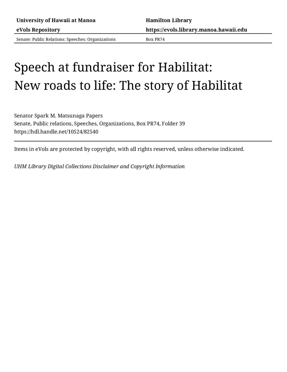 - Speech at fundraiser for Habilitat: New roads to life: The story of Habilitat