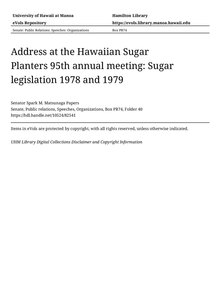 - Address at the Hawaiian Sugar Planters 95th annual meeting: Sugar legislation 1978 and 1979
