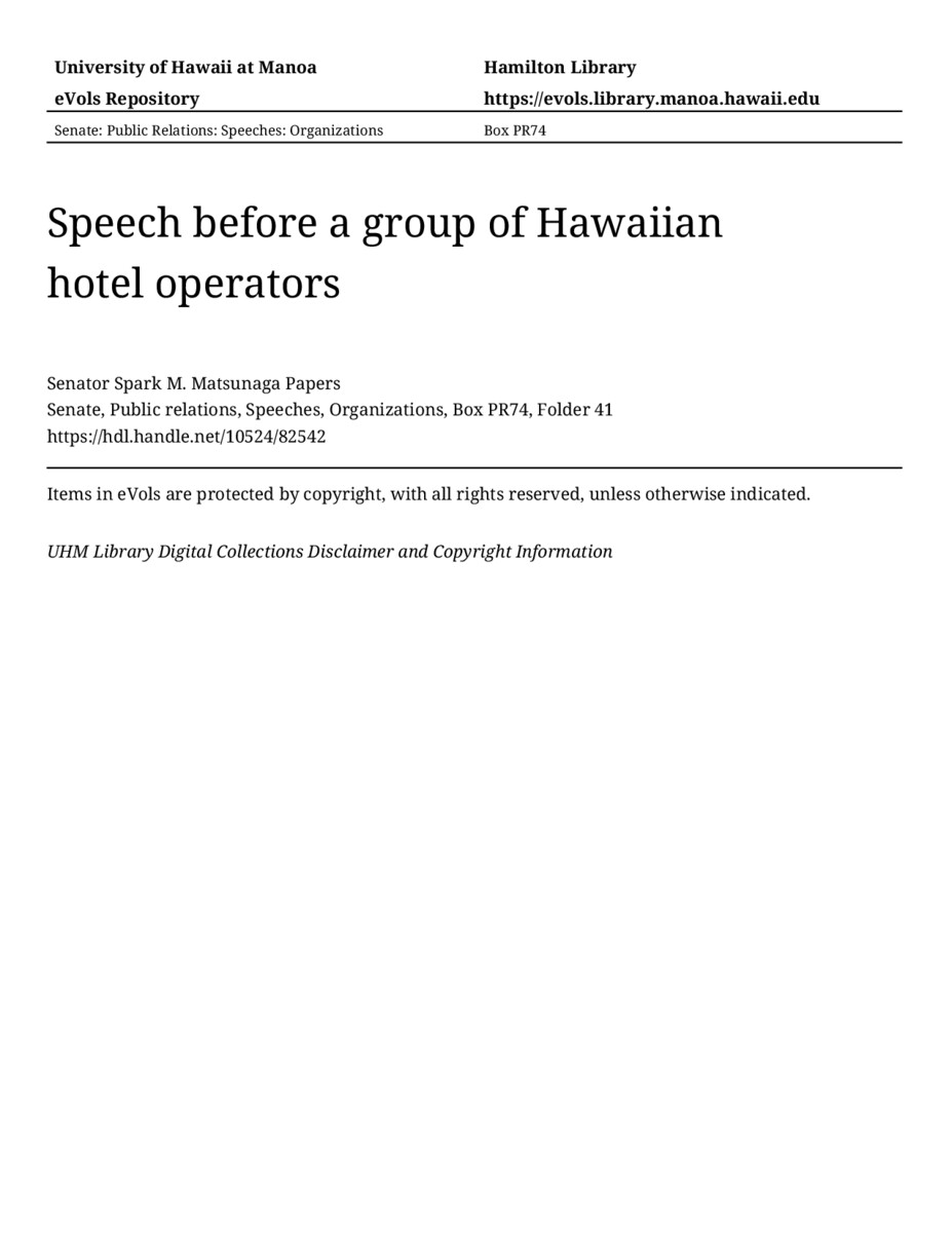 Speech before a group of Hawaiian hotel operators, 12/01/78, Senate, Public relations, Speeches, Organizations, Box PR74, Folder 41, Senator Spark M. Matsunaga Papers, Hawaiʻi Congressional Papers Collection, University of Hawaiʻi at Mānoa Library, Honolulu, HI. https://omekas-congress.lib.wvu.edu/catalog/10524_82542 (accessed April 18, 2026).