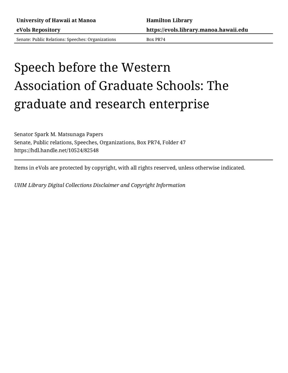 - Speech before the Western Association of Graduate Schools: The graduate and research enterprise