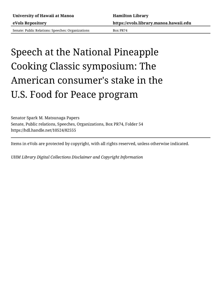 - Speech at the National Pineapple Cooking Classic symposium: The American consumer's stake in the U.S. Food for Peace program