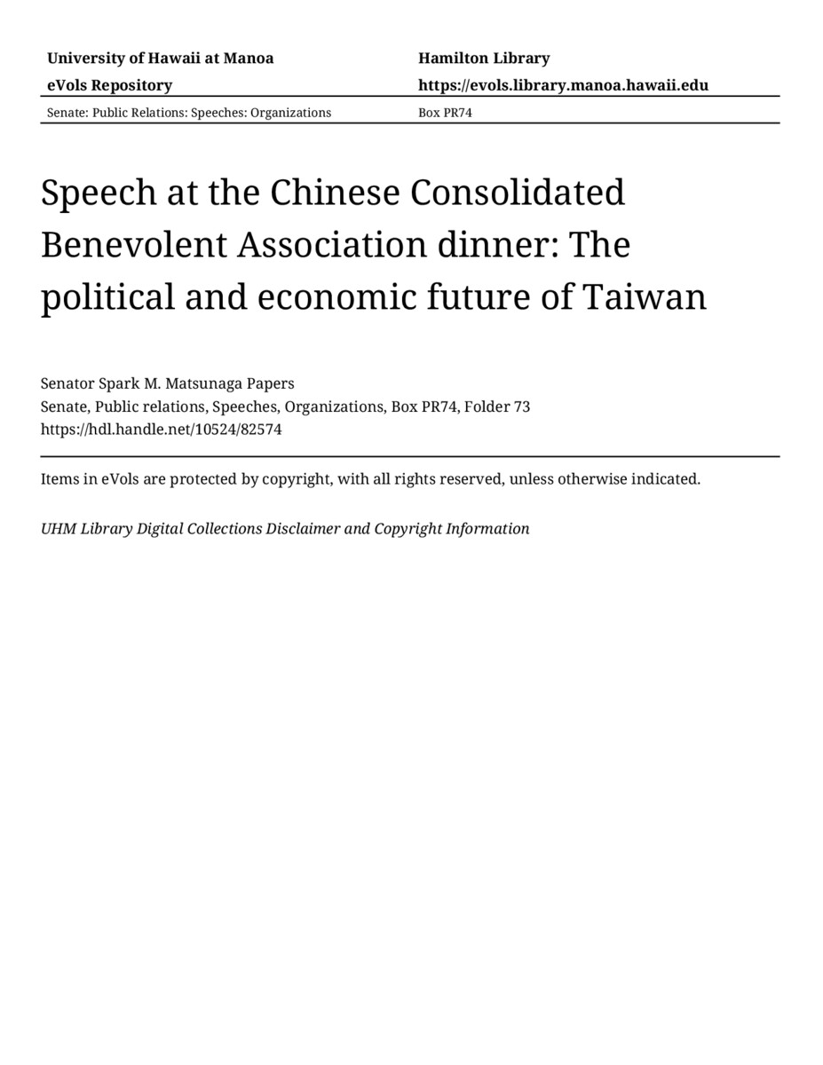 Speech at the Chinese Consolidated Benevolent Association dinner: The political and economic future of Taiwan