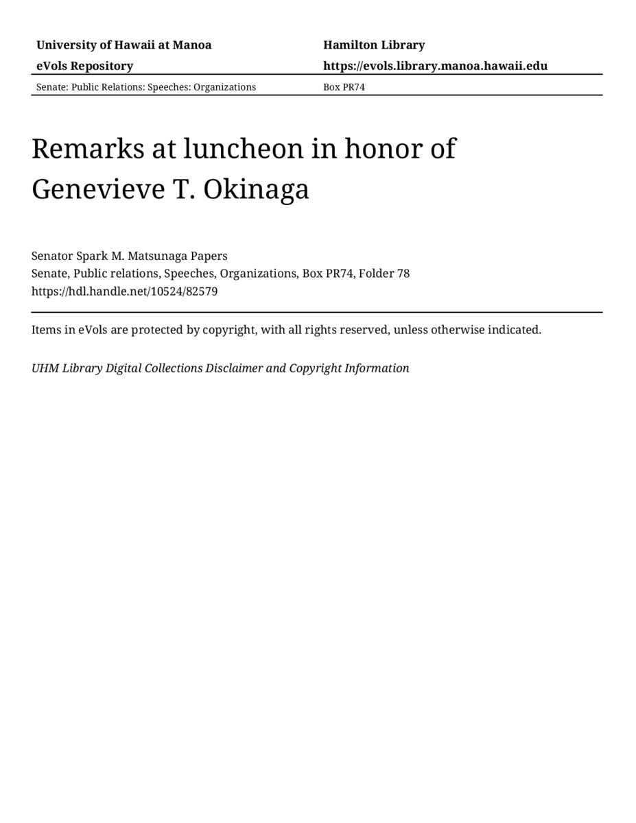 Remarks at luncheon in honor of Genevieve T. Okinaga, 11/19/79, Senate, Public relations, Speeches, Organizations, Box PR74, Folder 78, Senator Spark M. Matsunaga Papers, Hawaiʻi Congressional Papers Collection, University of Hawaiʻi at Mānoa Library, Honolulu, HI. https://omekas-congress.lib.wvu.edu/catalog/10524_82579 (accessed April 18, 2026).