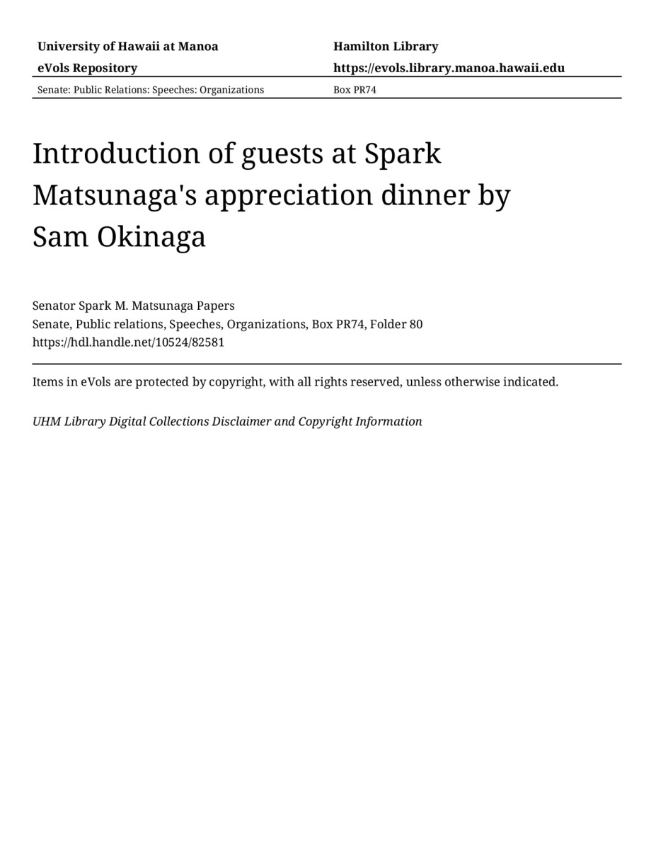 - Introduction of guests at Spark Matsunaga's appreciation dinner by Sam Okinaga