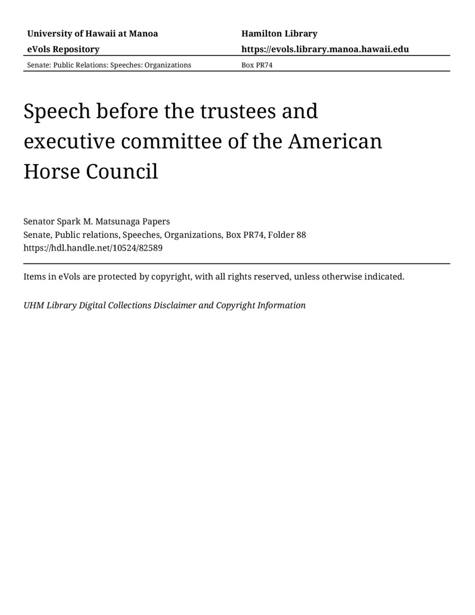 - Speech before the trustees and executive committee of the American Horse Council