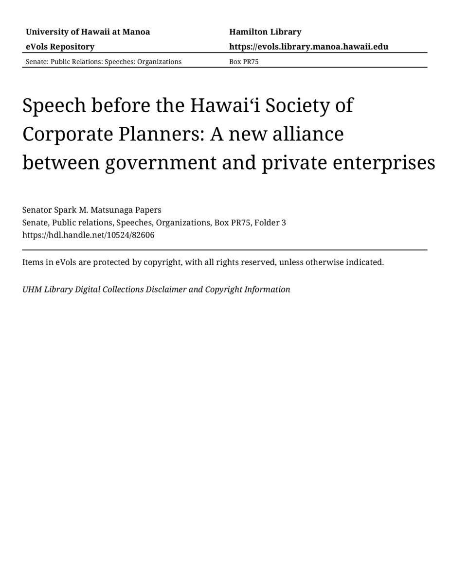 - Speech before the Hawaiʻi Society of Corporate Planners: A new alliance between government and private enterprises