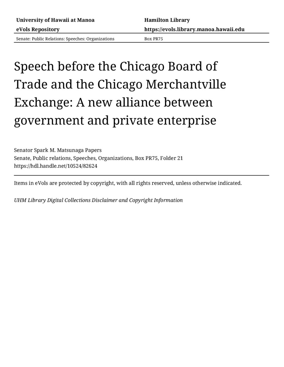 Speech before the Chicago Board of Trade and the Chicago Merchantville Exchange: A new alliance between government and private enterprise, 10/15/80, Senate, Public relations, Speeches, Organizations, Box PR75, Folder 21, Senator Spark M. Matsunaga Papers, Hawaiʻi Congressional Papers Collection, University of Hawaiʻi at Mānoa Library, Honolulu, HI. https://omekas-congress.lib.wvu.edu/catalog/10524_82624 (accessed April 19, 2026).