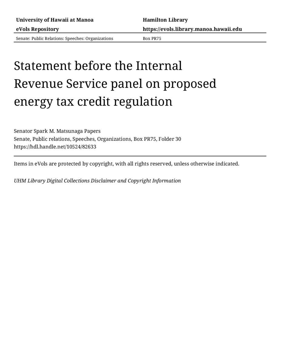 - Statement before the Internal Revenue Service panel on proposed energy tax credit regulation
