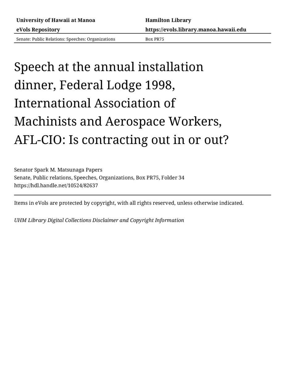 Speech at the annual installation dinner, Federal Lodge 1998, International Association of Machinists and Aerospace Workers, AFL-CIO: Is contracting out in or out?, 01/10/81, Senate, Public relations, Speeches, Organizations, Box PR75, Folder 34, Senator Spark M. Matsunaga Papers, Hawaiʻi Congressional Papers Collection, University of Hawaiʻi at Mānoa Library, Honolulu, HI. https://omekas-congress.lib.wvu.edu/catalog/10524_82637 (accessed April 15, 2026).