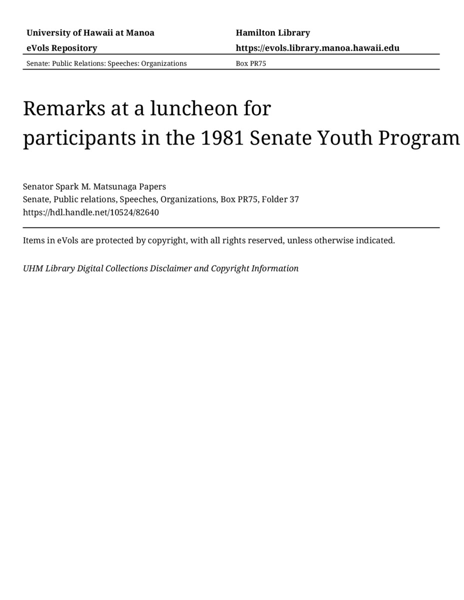 - Remarks at a luncheon for participants in the 1981 Senate Youth Program