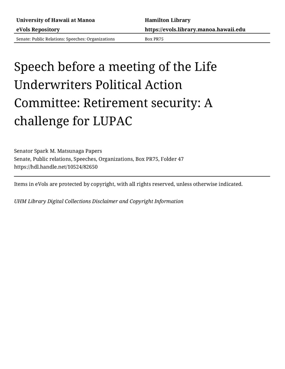 - Speech before a meeting of the Life Underwriters Political Action Committee: Retirement security: A challenge for LUPAC