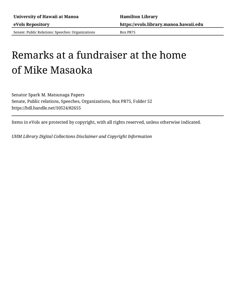 Remarks at a fundraiser at the home of Mike Masaoka, 05/16/81, Senate, Public relations, Speeches, Organizations, Box PR75, Folder 52, Senator Spark M. Matsunaga Papers, Hawaiʻi Congressional Papers Collection, University of Hawaiʻi at Mānoa Library, Honolulu, HI. https://omekas-congress.lib.wvu.edu/catalog/10524_82655 (accessed April 21, 2026).