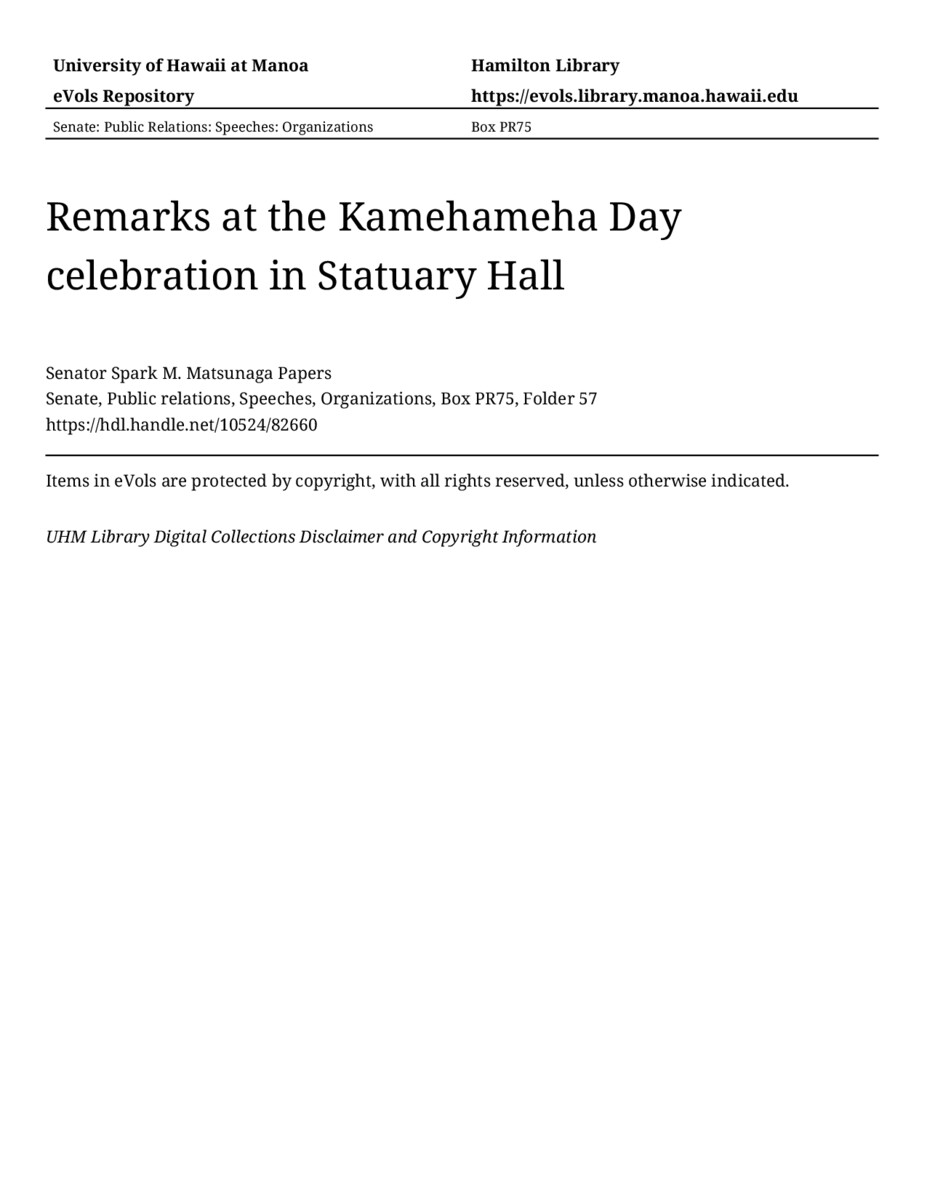 Remarks at the Kamehameha Day celebration in Statuary Hall, 06/11/81, Senate, Public relations, Speeches, Organizations, Box PR75, Folder 57, Senator Spark M. Matsunaga Papers, Hawaiʻi Congressional Papers Collection, University of Hawaiʻi at Mānoa Library, Honolulu, HI. https://omekas-congress.lib.wvu.edu/catalog/10524_82660 (accessed April 17, 2026).