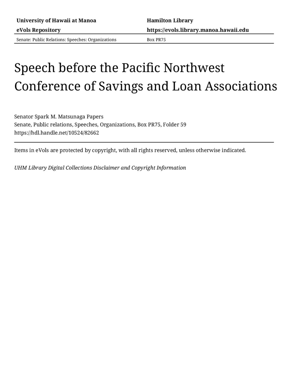 - Speech before the Pacific Northwest Conference of Savings and Loan Associations
