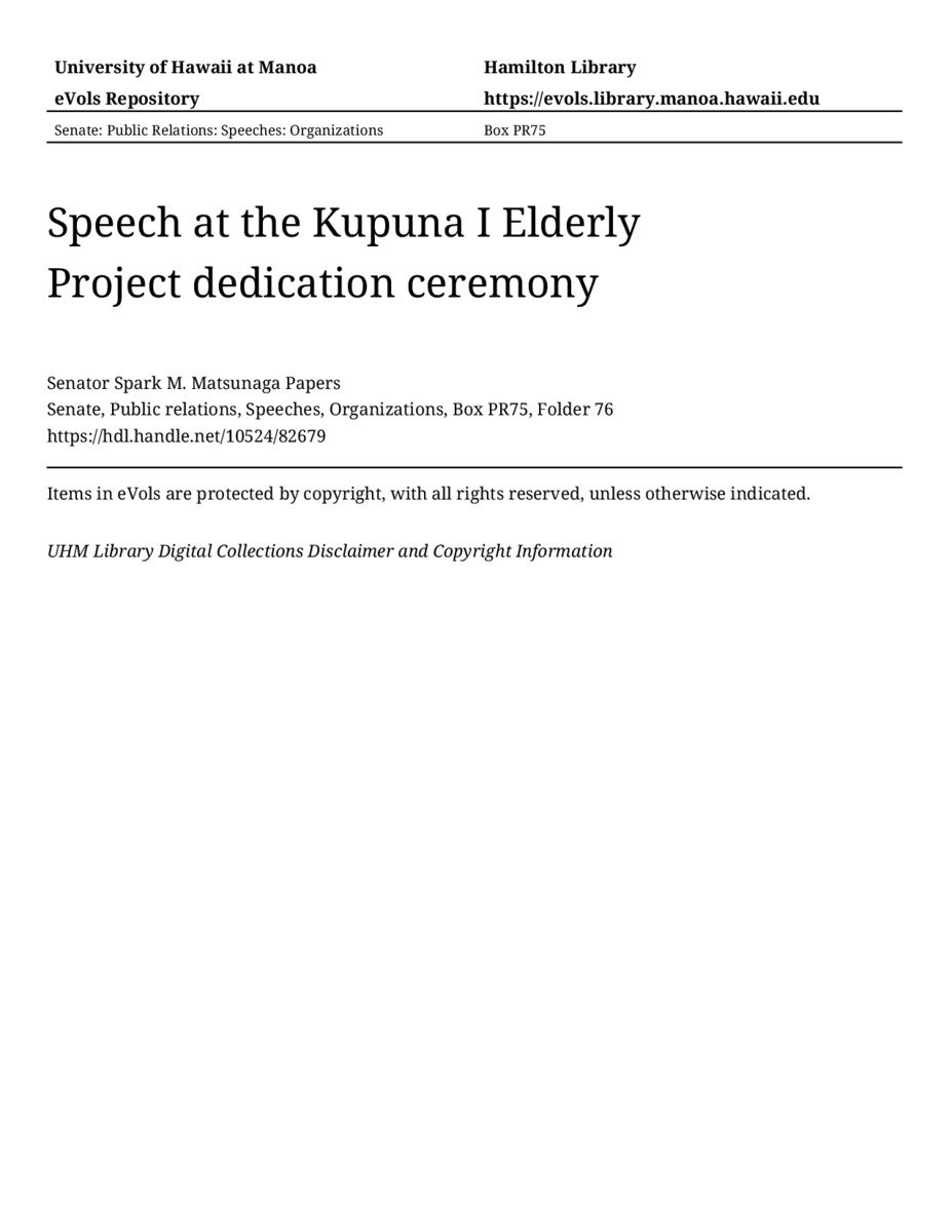 Speech at the Kupuna I Elderly Project dedication ceremony, 09/02/81, Senate, Public relations, Speeches, Organizations, Box PR75, Folder 76, Senator Spark M. Matsunaga Papers, Hawaiʻi Congressional Papers Collection, University of Hawaiʻi at Mānoa Library, Honolulu, HI. https://omekas-congress.lib.wvu.edu/catalog/10524_82679 (accessed April 23, 2026).