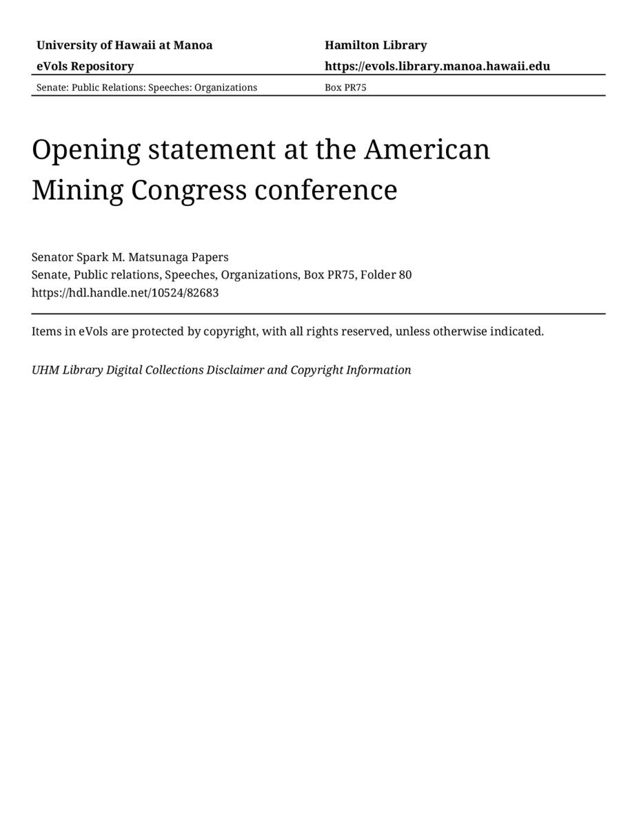 Opening statement at the American Mining Congress conference, 09/30/81, Senate, Public relations, Speeches, Organizations, Box PR75, Folder 80, Senator Spark M. Matsunaga Papers, Hawaiʻi Congressional Papers Collection, University of Hawaiʻi at Mānoa Library, Honolulu, HI. https://omekas-congress.lib.wvu.edu/catalog/10524_82683 (accessed April 21, 2026).