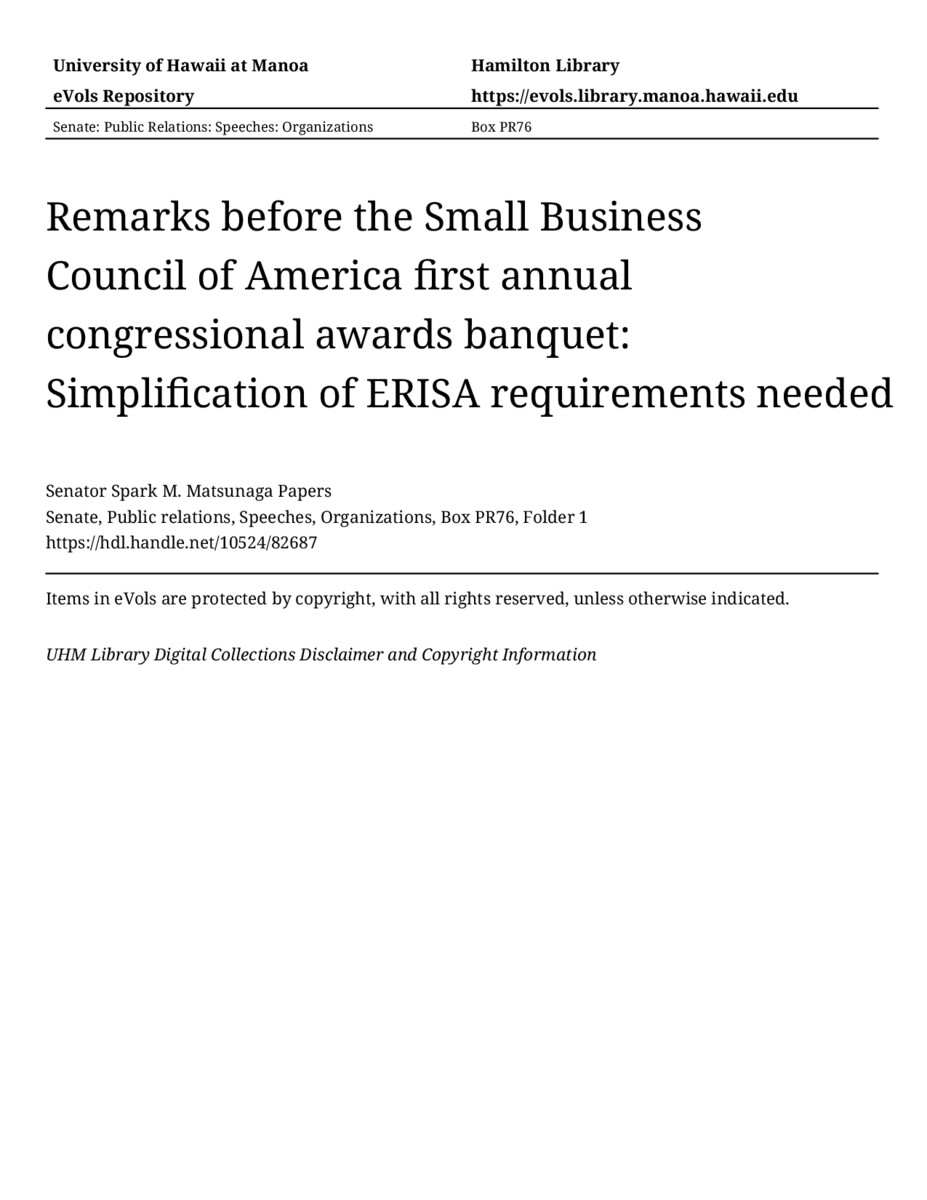 Remarks before the Small Business Council of America first annual congressional awards banquet: Simplification of ERISA requirements needed, 10/15/81, Senate, Public relations, Speeches, Organizations, Box PR76, Folder 1, Senator Spark M. Matsunaga Papers, Hawaiʻi Congressional Papers Collection, University of Hawaiʻi at Mānoa Library, Honolulu, HI. https://omekas-congress.lib.wvu.edu/catalog/10524_82687 (accessed April 19, 2026).