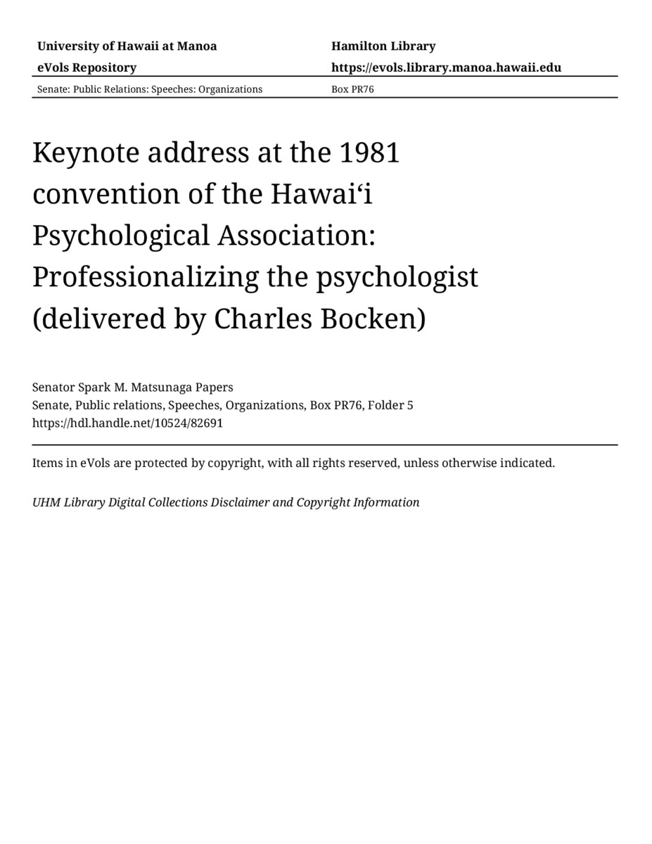 Keynote address at the 1981 convention of the Hawaiʻi Psychological Association: Professionalizing the psychologist (delivered by Charles Bocken), 12/05/81, Senate, Public relations, Speeches, Organizations, Box PR76, Folder 5, Senator Spark M. Matsunaga Papers, Hawaiʻi Congressional Papers Collection, University of Hawaiʻi at Mānoa Library, Honolulu, HI. https://omekas-congress.lib.wvu.edu/catalog/10524_82691 (accessed April 23, 2026).