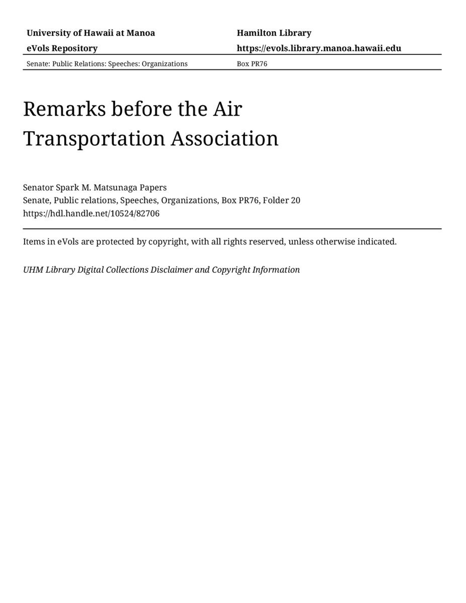 Remarks before the Air Transportation Association, 03/18/82, Senate, Public relations, Speeches, Organizations, Box PR76, Folder 20, Senator Spark M. Matsunaga Papers, Hawaiʻi Congressional Papers Collection, University of Hawaiʻi at Mānoa Library, Honolulu, HI. https://omekas-congress.lib.wvu.edu/catalog/10524_82706 (accessed April 23, 2026).