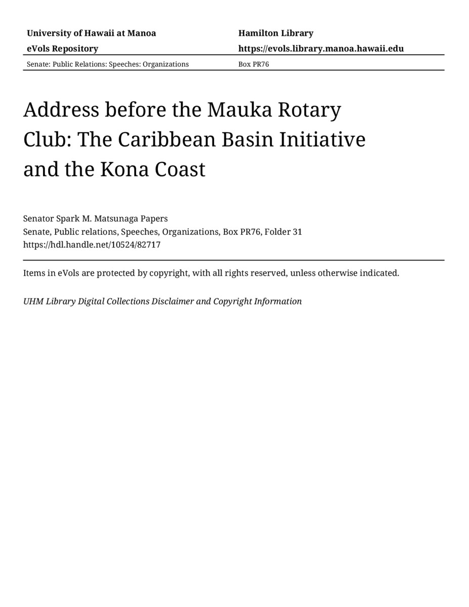 Address before the Mauka Rotary Club: The Caribbean Basin Initiative and the Kona Coast