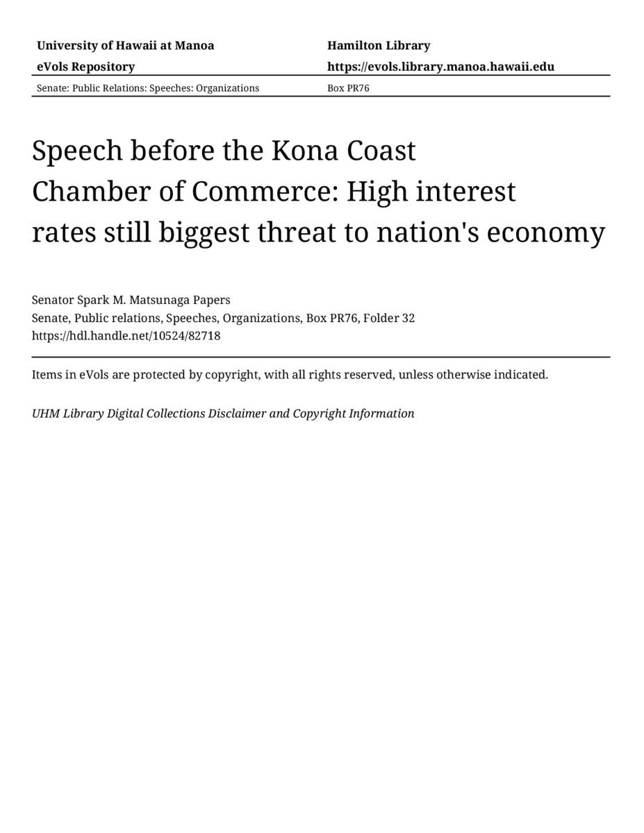 Speech before the Kona Coast Chamber of Commerce: High interest rates still biggest threat to nation's economy