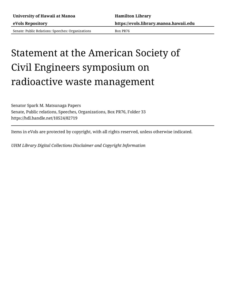 - Statement at the American Society of Civil Engineers symposium on radioactive waste management