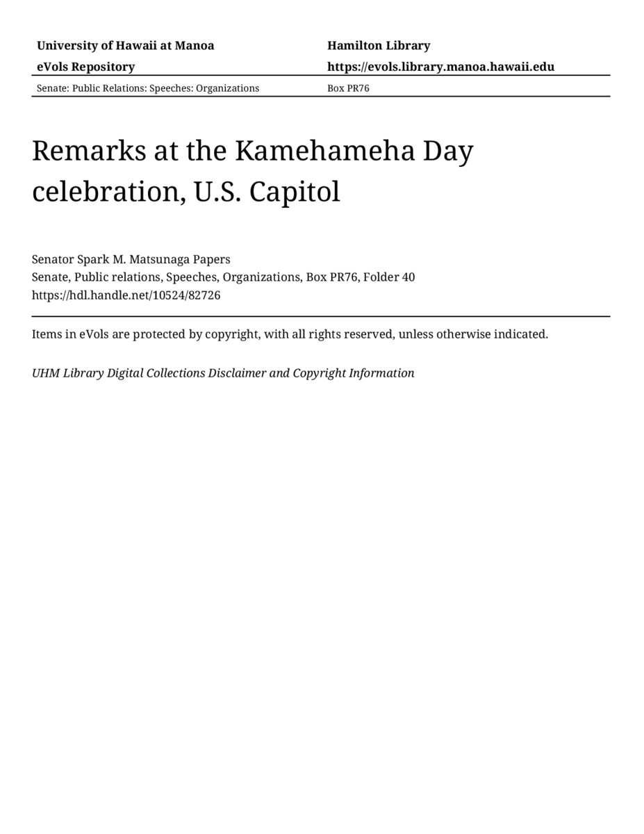 Remarks at the Kamehameha Day celebration, U.S. Capitol, 06/13/82, Senate, Public relations, Speeches, Organizations, Box PR76, Folder 40, Senator Spark M. Matsunaga Papers, Hawaiʻi Congressional Papers Collection, University of Hawaiʻi at Mānoa Library, Honolulu, HI. https://omekas-congress.lib.wvu.edu/catalog/10524_82726 (accessed April 16, 2026).